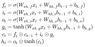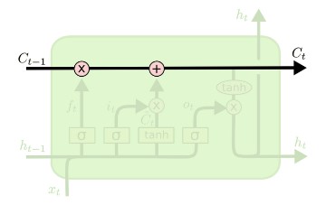 - 핵심 아이디어는 셀 스테이트에서 볼 수 있습니다. 그림에서 볼 수 있듯이 정보가 cell을 통과하며 정보를 계속 전달합니다. $c_t$를 계산하는 과정을 보겠습니다. $c_{t-1}$ 에 $f_t$가 곱해집니다. 이는 얼마나 잊을지 (forget)를 정하고 $i_t$ * $g_t$로 새로운 정보를 얼마나 더해줄지 정합니다.