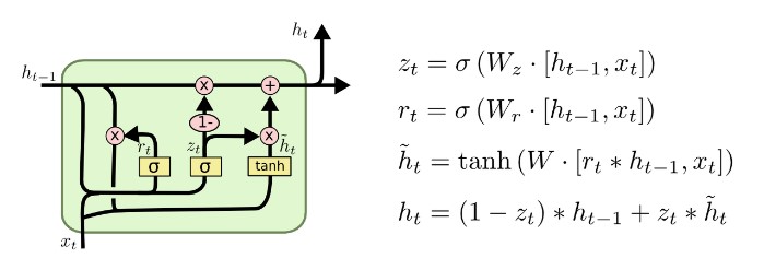 - $z_t$가 forget gate와 input gate를 합친 부분으로 과거정보와 최신정보의 비율을 정해줍니다. $h_t$에서 $(1-z_t)$와 $z_t$가 곱해진 부분을 보면 무슨 뜻인지 단번에 이해가 가능합니다