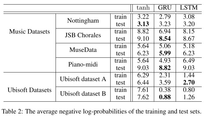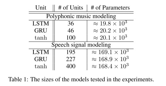 - 한가지 경우만 빼면 GRU와 LSTM이 tanh RNNs의 성능을 상회했습니다. 특히 스피치데이터에서는 gate unit이 있는 두 모델이 tanh RNN의 성능을 크게 웃돌았습니다.