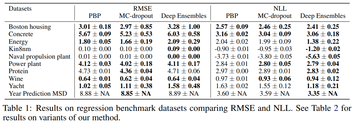 - 분류문제는 Negative Log Likelihood(NLL)과 앞서 살펴본 Brier score를 predictive uncertainty 평가에 사용했으며 회귀문제는 RMSE를 사용했다