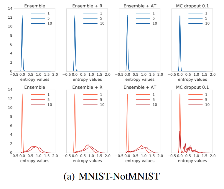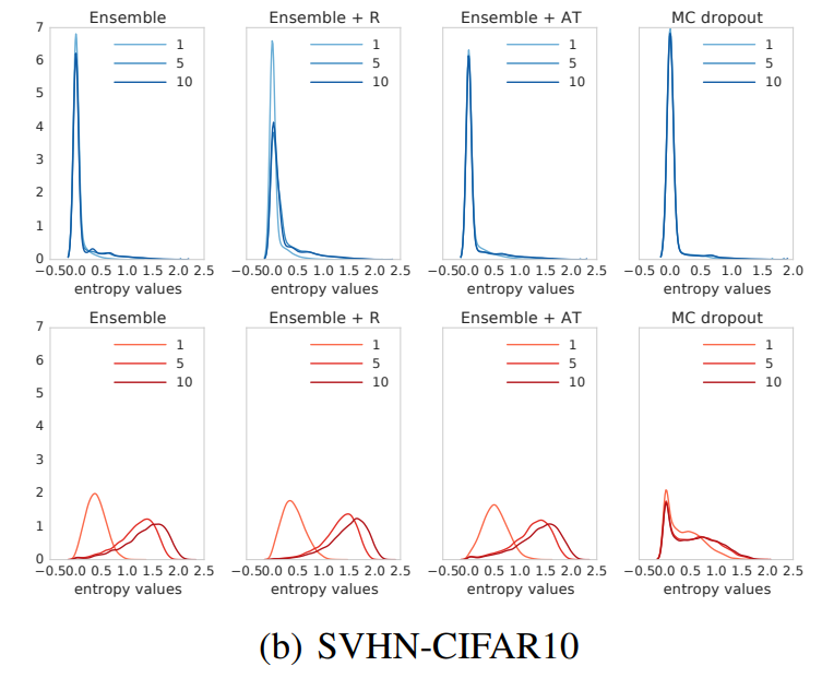 - known classes(파란계열 그래프)에서는 앙상블이나 MC-dropout 모두 작은 entropy를 보였다. 하지만 unknown dataset에 대해서는 앙상블이 무질서도가 더 빠르게 증가했다. 이는 OOD에 대해서 앙상블 방법이 더 불확실성을 잘 표현한다고 할 수 있다