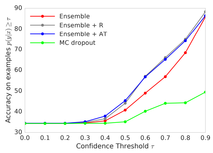 - MNIST로 학습되었고 MNIST+NotMNIST mixture로 test되었다. MC-dropout같은 경우는 confidence가 높아도 accuracy는 높지 못하다. 즉 overconfident하다